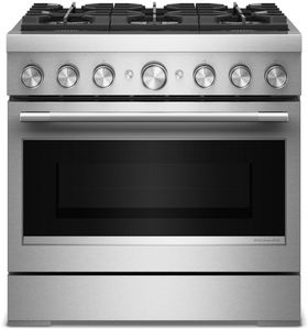 Expand your skills with a 36-inch KitchenAid® commercial style range with 6 burners. This dual fuel range combines a gas cooktop with the even baking of an electric oven. Two 20,000 BTU ultra power™ dual-flame burners offer the power and precision to successfully sear, simmer, stir-fry and sauté.Read More